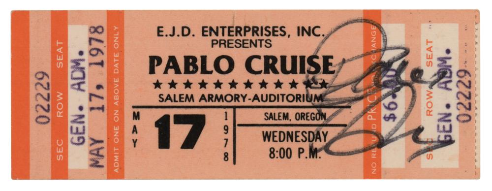 Glossy 6.5 x 4.75 A&M Records postcard photo of Pablo Cruise, signed in green felt tip by Cory Lerios, and in black ink by Bruce Day, Steve Price, and Dave Jenkins. Includes a ticket for a Pablo Cruise concert at the Salem Armory Auditorium in Salem, Oregon on May 17, 1978, which is signed by Day. In overall fine condition.