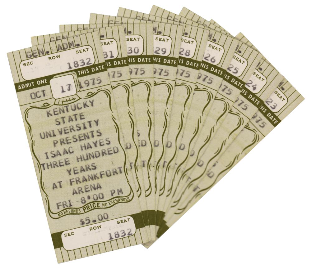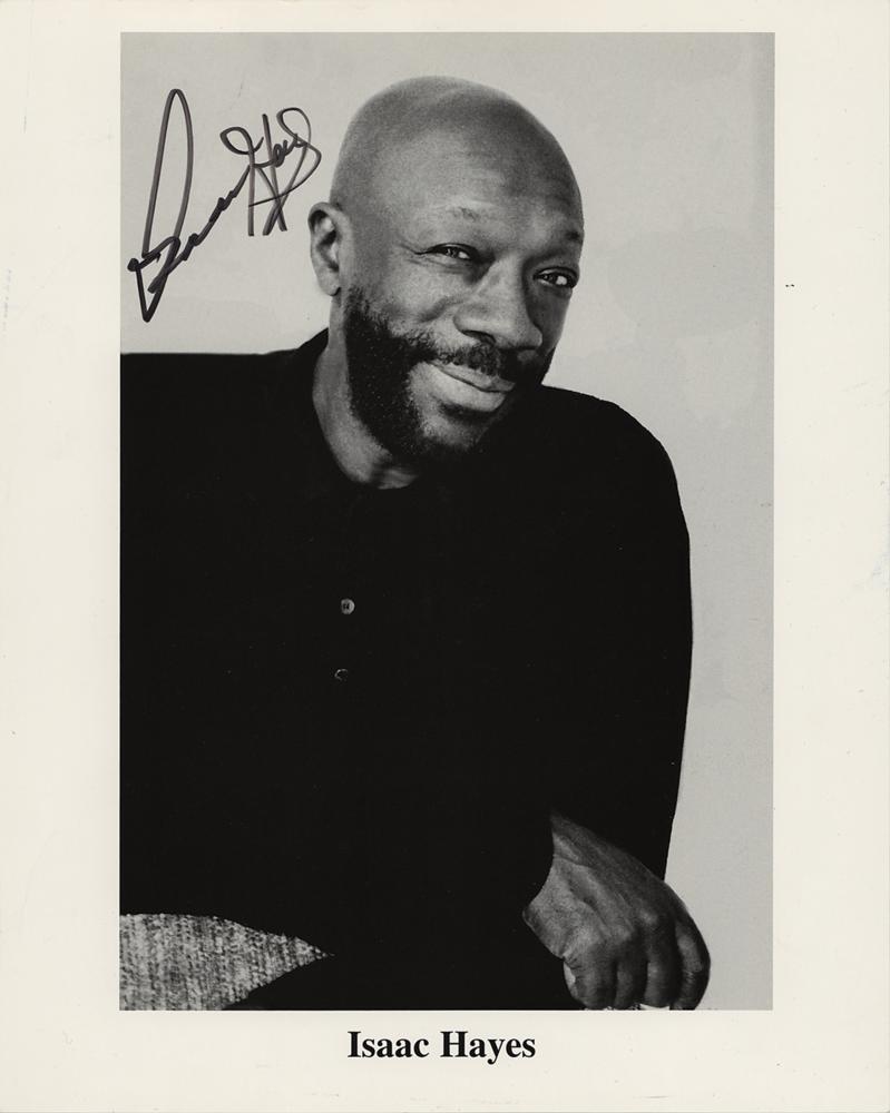 Glossy 8 x 10 promotional photo of Isaac Hayes, signed in black felt tip. In very good to fine condition, with scattered small creases. Accompanied by a transmittal letter from 2004 and by a group of 10 concert tickets for an Isaac Hayes concert at the Frankfurt Arena on October 17, 1975.