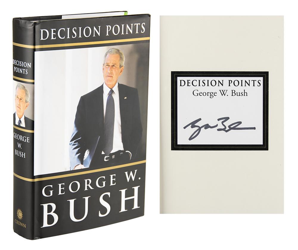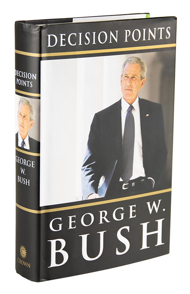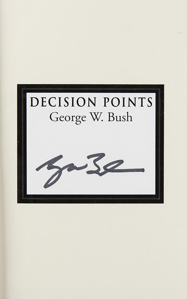 Signed book: Decision Points. Later printing. NY: Crown Publishers, 2010. Hardcover with dust jacket, 6.5 x 9.5, 497 pages. Signed in black felt tip by George W. Bush on a bookplate affixed to the first free end page. In fine condition.