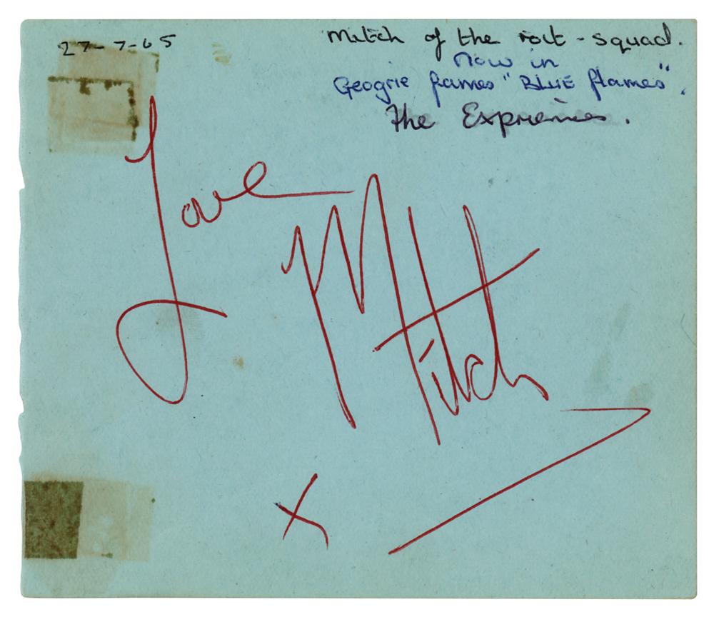 Vintage red ballpoint signature, "Love, Mitch, x,” on a light blue 4.5 x 4 album page, bearing a collector's date notation of July 27, 1965. In fine condition, with two old tape stains to the left side.