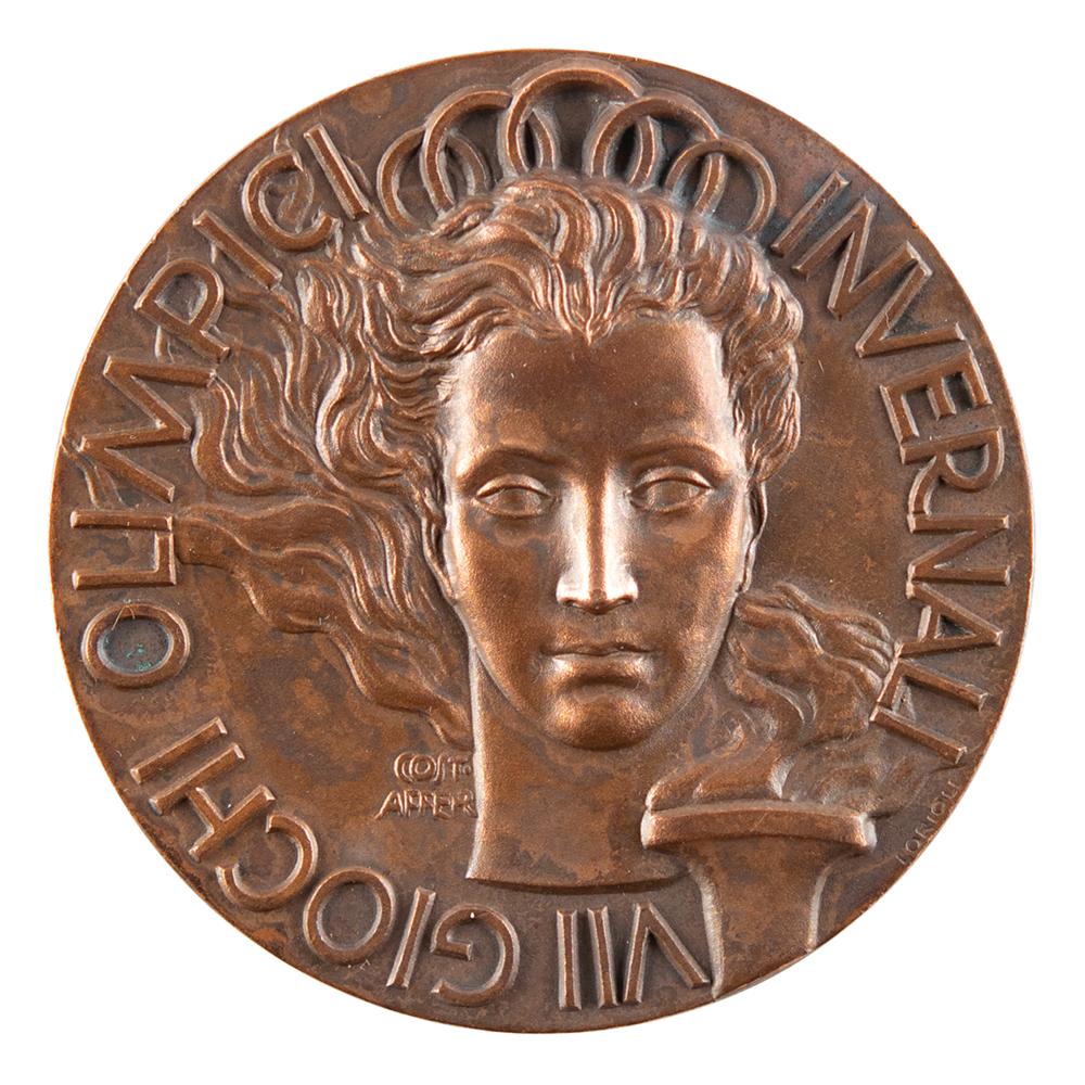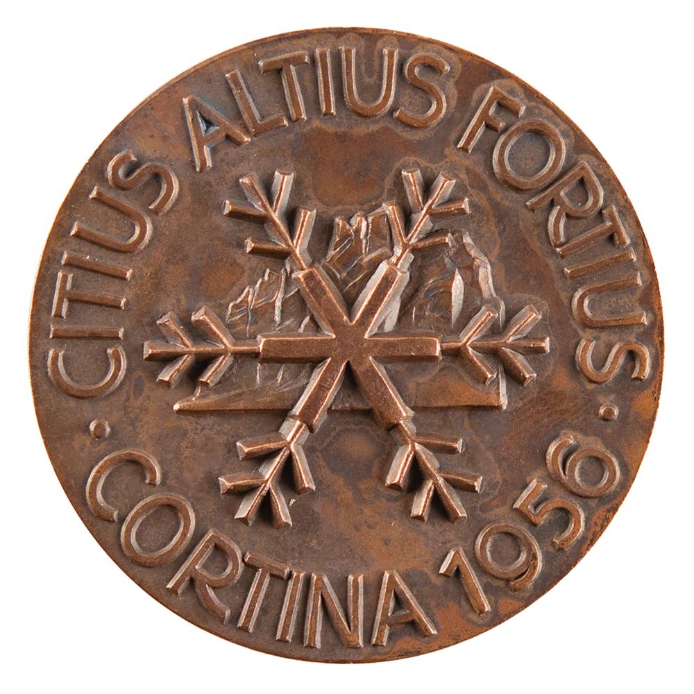 Winner’s medal issued for the Cortina 1956 Winter Olympics. Bronze, 60 mm, 118 gm, by Constantino After, Milan. The front, inscribed, “VII Giochi Olimpici Invernali,” features the head of Victory crowned in Olympic rings with a torch to the right; the reverse, inscribed, “Citius Altius Fortius, Cortina 1956,” portrays an ice crystal over Mt. Pomagagnon. The designer name, “Cost/Affer,” is visible to the left of Victory’s neck, and the mint can be found on the right rim, “Lorioli.” Bears some evidence of tarnishing. Cortina d'Ampezzo was initially selected to host the fifth Winter Olympics in 1944, but the Games were canceled due to the onset of World War II. Awarded as a Winter host twelve years later, Cortina is best remembered for the debut of Soviet athletes in a Winter Olympiad, as well as for the first instance in which the Olympics were internationally televised. A handsome and extremely scarce winner’s medal from the Cortina Games, one of a total of 50 third-place prizes issued.