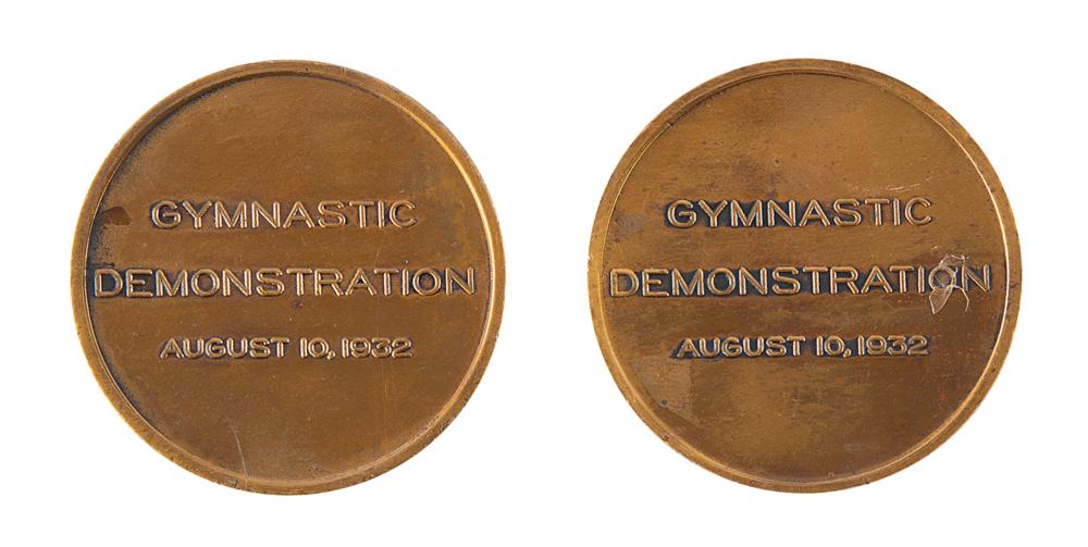 Two participation medals issued for a gymnastics demonstration event at the Los Angeles 1932 Summer Olympics. Bronze, 38 mm, 28 gm, by Julio Kilenyi. The front depicts an athlete standing with an unfurled Olympic flag reading "Xth Olympiad 1932." The reverse has the raised legend: "Gymnastic Demonstration, August 10, 1932." Stamped on the edge by J. A. Meyers & Co. of Los Angeles.
