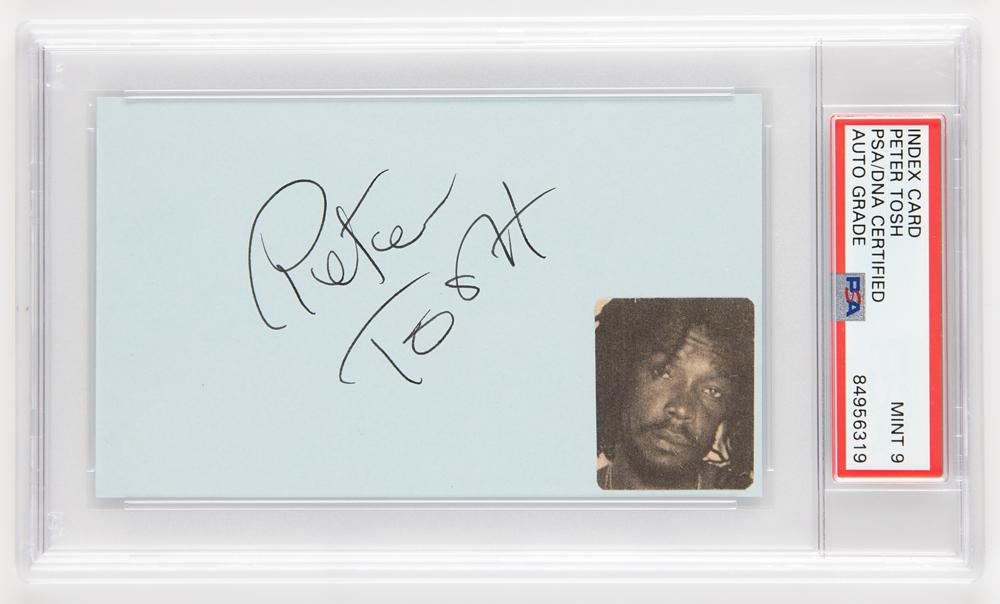 Reggae legend and former Bob Marley & The Wailers band member (1944-1987). Black felt tip signature, "Peter Tosh,” on a blue 5 x 3 card. In very fine condition, with a photo of Tosh affixed to the lower right corner. Encapsulated and graded by PSA/DNA as "MINT 9."