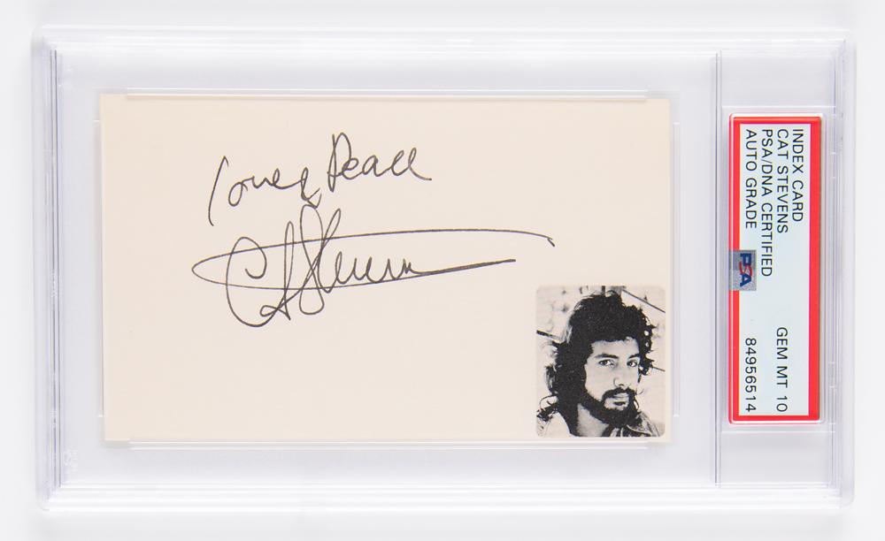 Choice fountain pen signature by the folk rock singer-songwriter, "Love & Peace, Cat Stevens,” on an off-white 5 x 3 card. In very fine condition, with a photo of Stevens affixed to the lower right corner. Encapsulated and graded by PSA/DNA as "GEM MT 10."