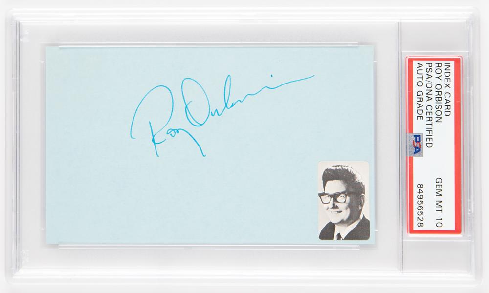 Vintage fountain pen signature by the singer and guitarist, "Roy Orbison,” on a blue 5 x 3 card. In very fine condition, with a photo of Orbison affixed to the lower right corner. Encapsulated and graded by PSA/DNA as "GEM MT 10."