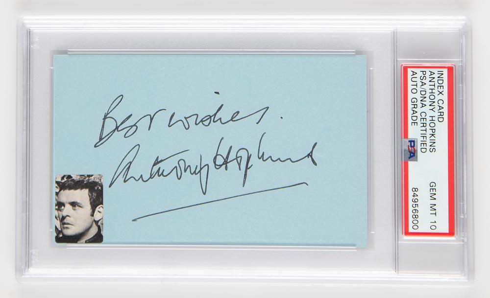 Fountain pen signature by the Olivier Award-winning actor, "Best wishes, Anthony Hopkins,” on a blue 5 x 3 card. In very fine condition, with a photo of Hopkins affixed to the lower left corner. Encapsulated and graded by PSA/DNA as "GEM MT 10."