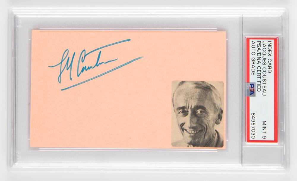 Blue felt tip signature by the acclaimed seafaring explorer, "Jacques Cousteau,” on an orange 5 x 3 card. In very fine condition, with a photo of Cousteau affixed to the lower right corner. Encapsulated and graded by PSA/DNA as "MINT 9."