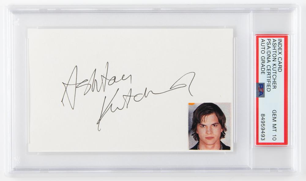 Ideal black felt tip signature from the That '70s Show star, "Ashton Kutcher,” on a white 4.75 x 2.75 card. In very fine condition, with a photo of Kutcher affixed to the lower right corner. Encapsulated and graded by PSA/DNA as "GEM MT 10."