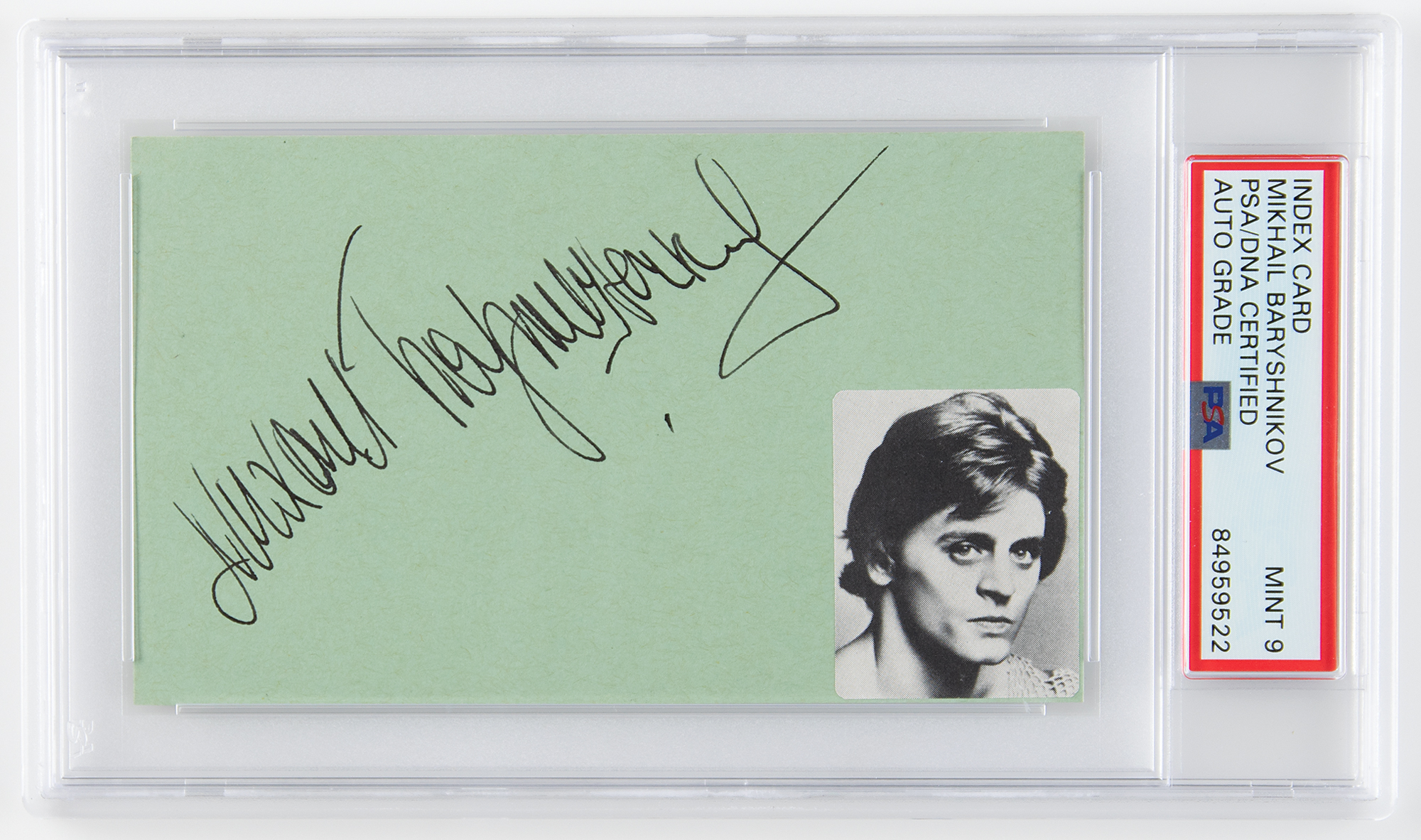 Fountain pen signature by ballet icon Mikhail Baryshnikov, who signs his name in Russian on a green 5 x 3 card. In very fine condition, with a photo of Baryshnikov affixed to the lower right corner. Encapsulated and graded by PSA/DNA as "MINT 9."
