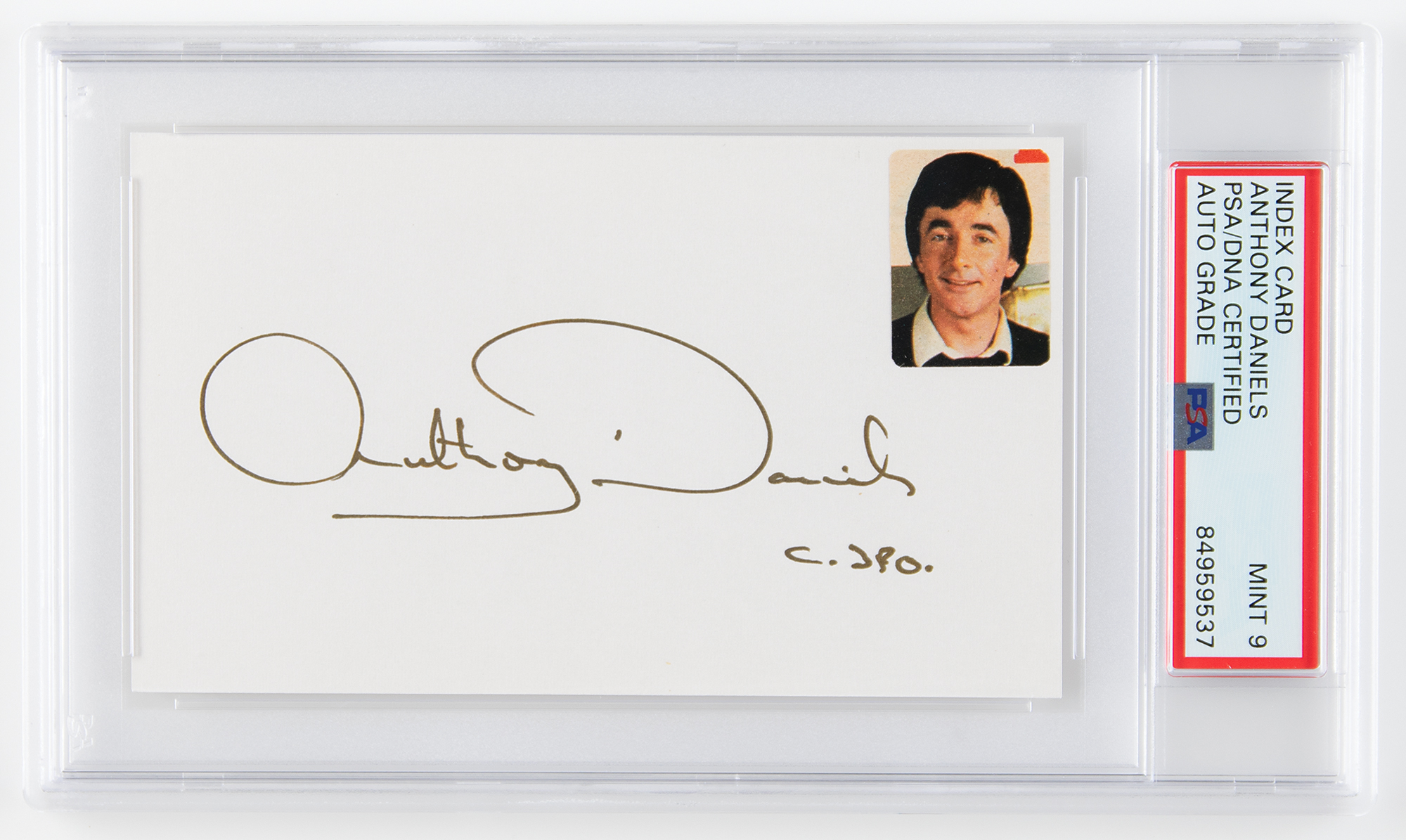 Gold ink signature by the Star Wars actor, "Anthony Daniels, 'C-3PO',” on a white 5 x 3 card. In very fine condition, with a photo of Daniels affixed to the upper right corner. Encapsulated and graded by PSA/DNA as "MINT 9."