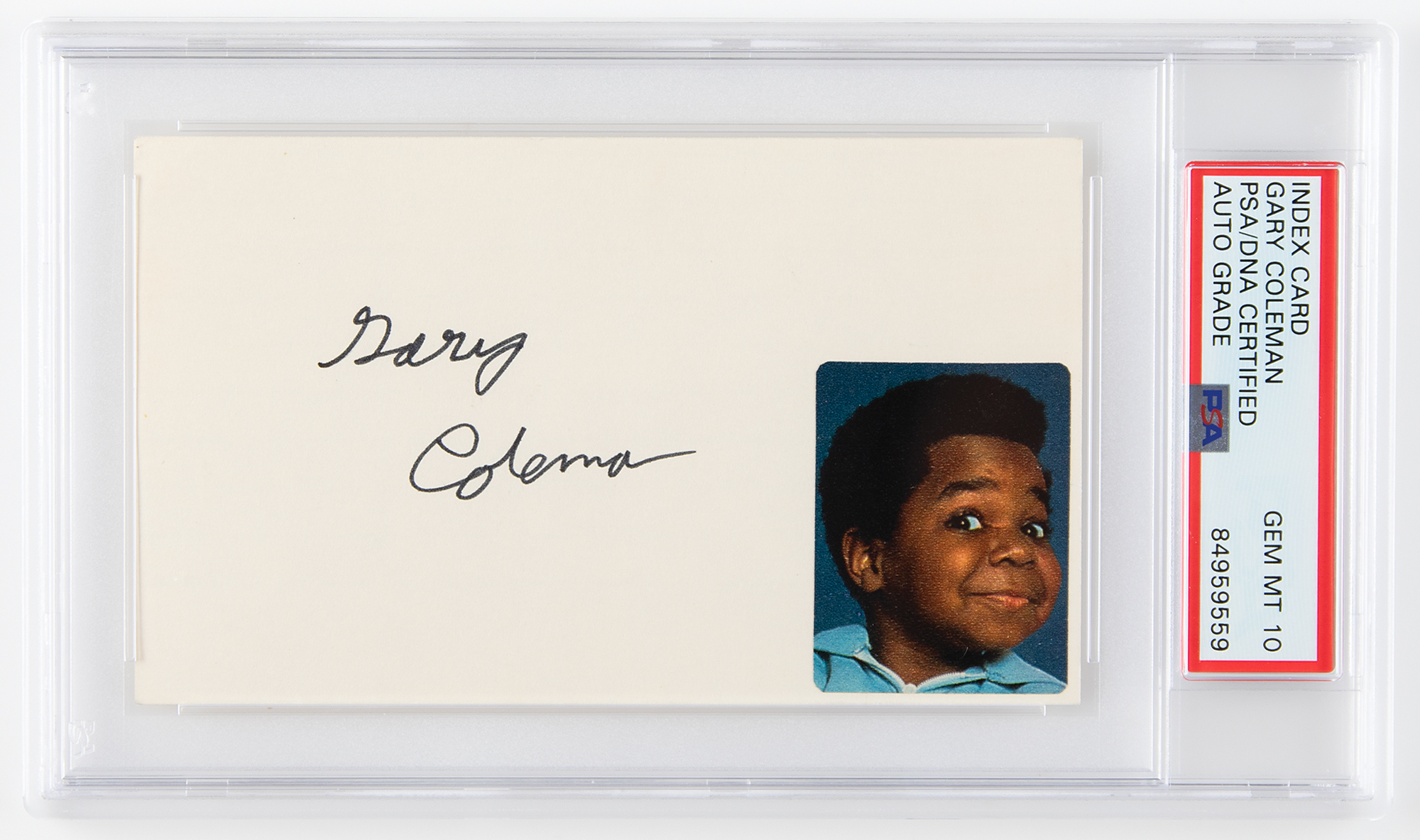Pristine black felt tip signature by the sitcom star, "Gary Coleman,” on an off-white 5 x 3 card. In very fine condition, with a photo of Coleman affixed to the lower right corner. Encapsulated and graded by PSA/DNA as "GEM MT 10."