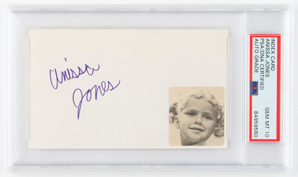 Vintage purple felt tip signature by the young sitcom actress, "Anissa Jones,” on an off-white 5 x 3 card. In very fine condition, with a photo of Jones affixed to the lower right corner. Encapsulated and graded by PSA/DNA as "GEM MT 10."