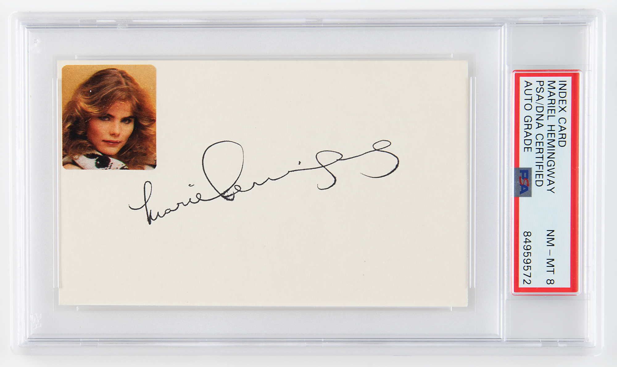 Black felt tip signature by the popular actress, "Mariel Hemingway,” on an off-white 5 x 3 card. In very fine condition, with a photo of Hemingway affixed to the upper left corner. Encapsulated and graded by PSA/DNA as "NM-MT 8."