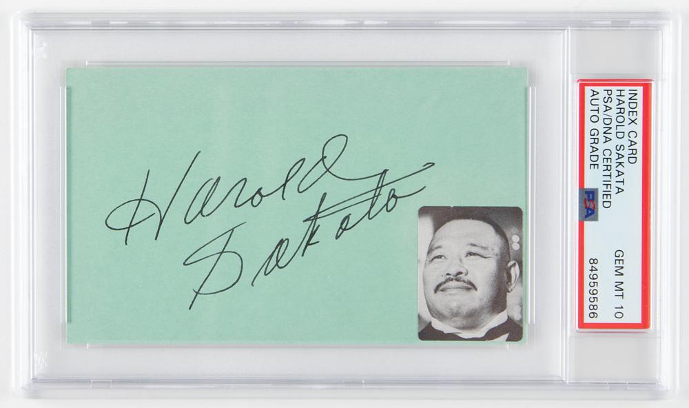 Japanese-American actor (1920-1982) and former silver medal-winning Olympic wrestler best known for his role as the deadly hat-wielding Oddjob in the classic Bond film Goldfinger. Vintage fountain pen signature, "Harold Sakata,” on a green 5 x 3 card. In very fine condition, with a photo of Sakata affixed to the lower right corner. Encapsulated and graded by PSA/DNA as "GEM MT 10."