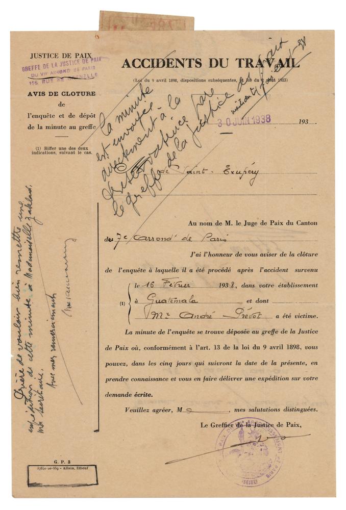Fascinating partly-printed DS, signed “Saint-Exupery,” one page, 6.75 x 9.75, June 30, 1938. An official “Accidents at Work” document from a justice of the peace in Paris, sent to Saint-Exupery to inform him “of the closure of the investigation which was carried out after the accident which occurred on February 16, 1938, in your establishment in Guatemala and of which Mr. Andre Prevot was a victim.” Signed vertically on the left side in ink by Antoine de Saint-Exupery. In fine condition.