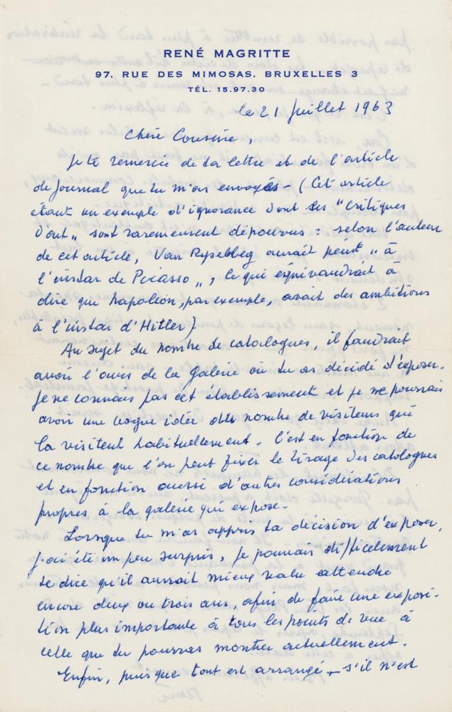 Belgian surrealist artist (1898-1967) known for his depictions of familiar objects in unfamiliar, unexpected contexts, which often provoked questions about the nature and boundaries of reality and representation. His imagery has influenced pop art, minimalist art, and conceptual art. ALS signed “Rene,” one page both sides, 5.5 x 8.5, personal letterhead, July 21, 1963. An untranslated and neatly penned handwritten letter from Rene Magritte to his cousin. In fine condition.