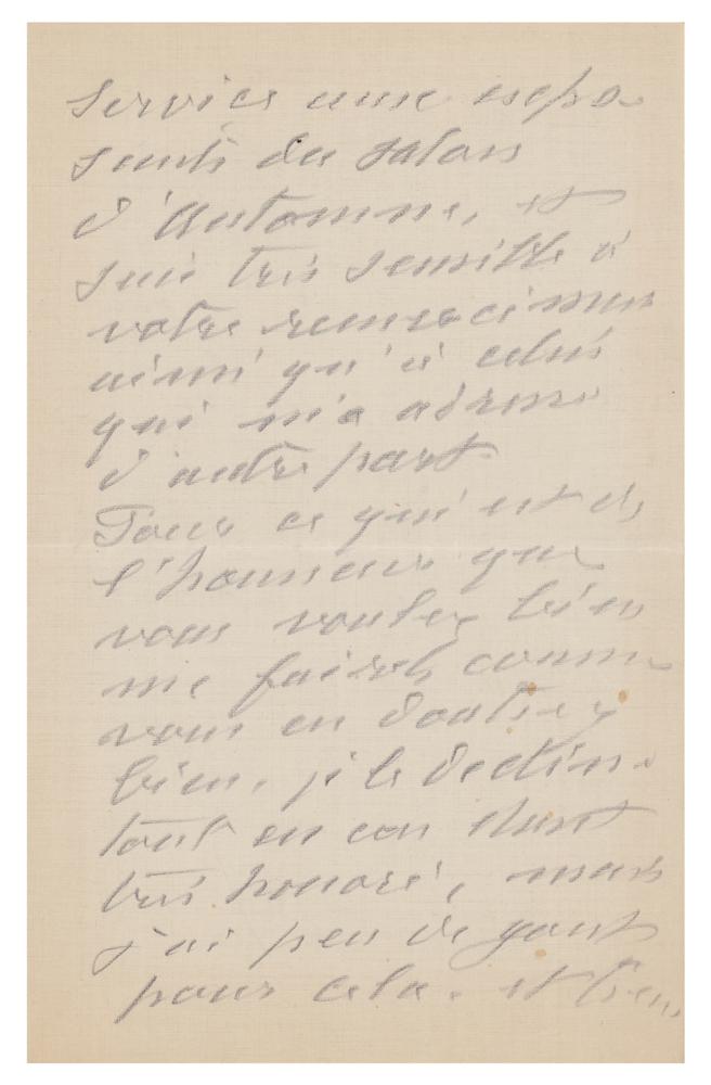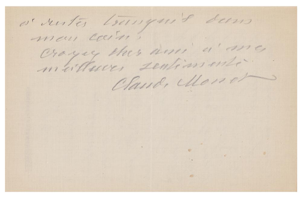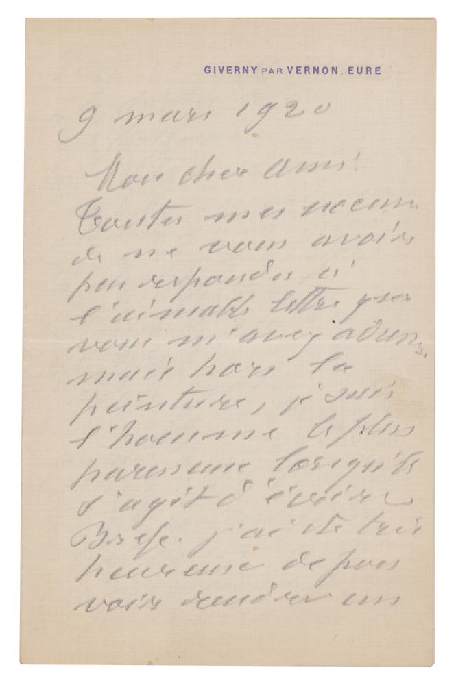 ALS in French, three pages on two adjoining sheets, 5 x 8, Giverny par Vernon letterhead, March 9, 1920. A handwritten letter in pencil from Claude Monet to a friend, ostensibly Gustave Geffroy, in full: “All my excuses for not having answered earlier your very kind letter that you have sent me but apart from painting I am the laziest man in regards to writing. I was very happy to be able to ask a favor from the artist of the Salon d’ Autumne and I am very touched by your thanks as well as those that were addressed to me from you. Regarding the honor that you are so kind to do me as you probably can guess I decline it. While feeling very honored but I have little taste for that and would like to stay tranquil in my little corner. Please believe me your close friend.” In fine condition.