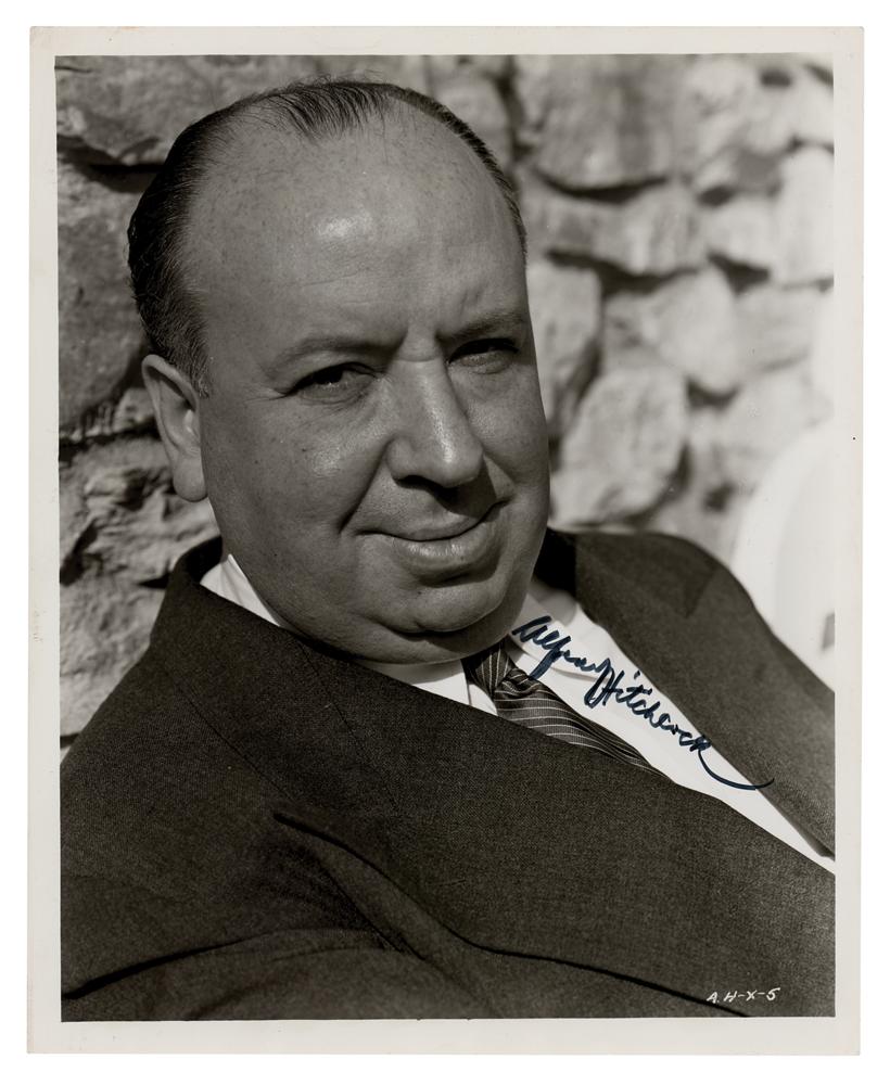 Glossy 8 x 10 promo photo of Hitchcock in a suit and tie, signed in black felt tip, "Alfred J. Hitchcock." Reverse bears an affixed Selznick International Pictures caption, claiming that the director would receive an Oscar nomination for his 1947 film noir courtroom drama The Paradine Case. In very good to fine condition, with scattered creasing and surface scratching.
