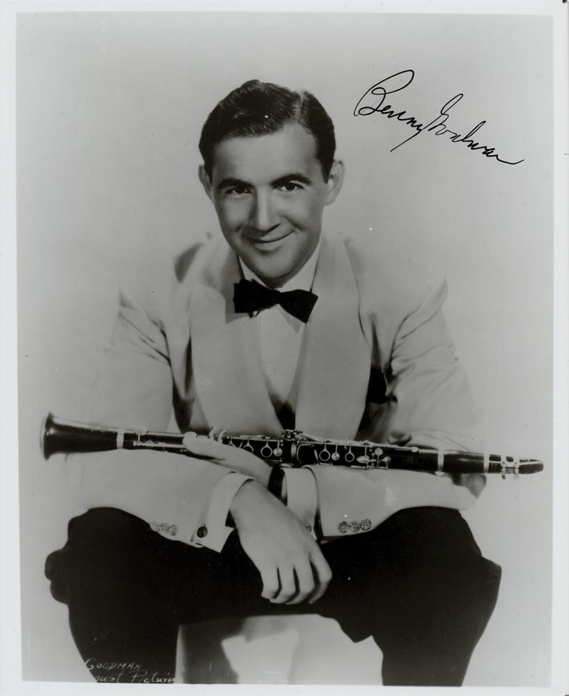 Glossy 8 x 10 three-quarter-length photo of Benny Goodman with his clarinet, signed in black felt tip. In fine condition.
