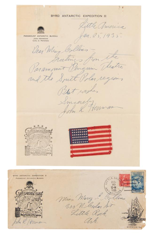 Interesting archive of material from the personal collection of John Lovejoy Herrmann, a photographer for Paramount Pictures who served as cinematographer on Richard E. Byrd’s second Antarctic Expedition of 1934. The archive is highlighted by two fabric American flags, 3 x 2 and 17 x 11.5, the smaller of which includes an ALS from Herrmann on his Paramount Antarctic Bureau letterhead, addressed from the Little American exploration base on January 25, 1935: “Greetings from the Paramount Penguin Theatre and the South Polar Region.” The larger flag is accompanied by a mailing envelope that is annotated in pencil, “John Herrmann gave Sam this flag—It was with Byrd when he flew over the South Pole.” Also included: a 5.25 x 4.25 postcard signed on the front by Herrmann and Carl Petersen, featuring an ANS from Herrmann on the reverse, addressed from Little America on February 3, 1934; a vintage matte-finish 8 x 10 publicity photo of Herrmann with his Paramount camera, signed and inscribed in fountain pen; an original color 24 x 18 “Authorized Map of the Second Byrd Antarctic Expedition,” published in 1934 by the G. F. Corps; an 8.25 x 10 etching of Richard E. Byrd with facsimile signature; a vintage 1934 copy of The South Pole Picture Book; two issues of South Pole Radio News; and newspaper clippings related to Herrmann’s eventual return from the Antarctic. In overall fine condition, with cover detached from South Pole Picture Book. The letters are accompanied by their original mailing envelopes hand-addressed by Herrmann.