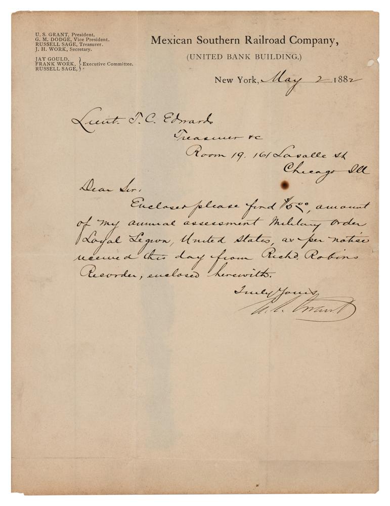 LS, one page, 8.25 x 11, Mexican Southern Railroad Company letterhead, May 2, 1882. Letter sent with his dues to Lieut. T. C. Edwards of the Military Order of the Loyal Legion. In full: "Enclosed please find $5.00, amount of my annual assessment, Military Order Loyal Legion, United States as per notice received this day from Richd. Robbins, recorder, Enclosed herewith." In very good to fine condition, with light show through from some old mounting residue on the back, a small stain, and three repaired punch holes along the right edge.