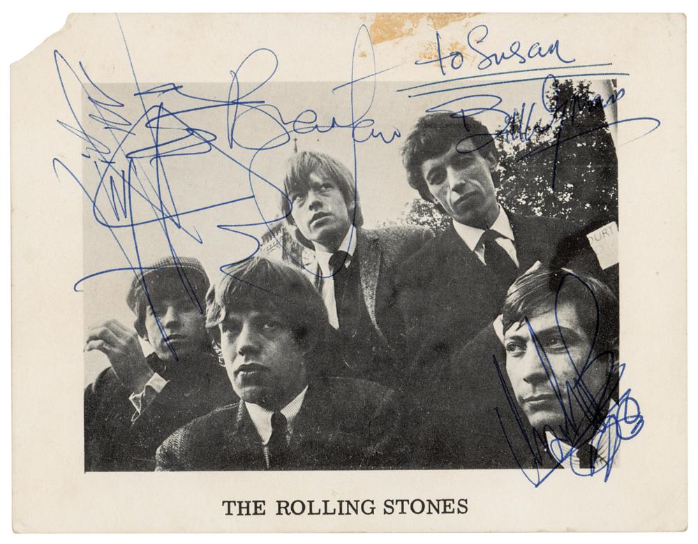 Vintage 5.5 x 4.25 UK promotional card for the Rolling Stones, signed and inscribed in blue ballpoint, “To Susan, Bill Wyman,” “Brian Jones,’ “Keith Richard,” “Mick Jagger,” and “Charlie Watts.” The consignor notes that the signatures date to 1964. In very good to fine condition, with an old tape stain to the top edge, and a missing upper left corner tip. Accompanied by a certificate of authenticity from Tracks.