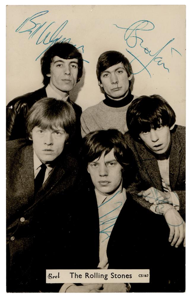 Vintage glossy 3.5 x 5.5 publicity postcard photo of the Rolling Stones (Brel CS167), signed in blue ballpoint by Mick Jagger, Brian Jones, Keith Richard, Bill Wyman, and Charlie Watts. In fine condition, with very poor contrast to Jagger, Richards, and (especially) Watts, whose pen appears to have run out of ink.
