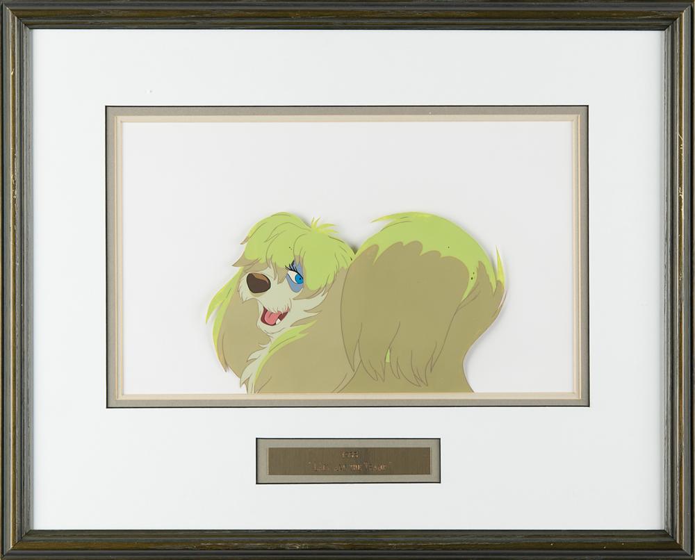 (Walt Disney Studios, 1955) Original production cel of Peg from Lady and the Tramp, depicting the sassy Pekingese smiling and looking over her shoulder. Image measures 8.25 x 5, with a mat opening of 12.5 x 7.5. Triple-matted and framed with an engraved plate to an overall size of 19.25 x 15.5. In fine condition.
