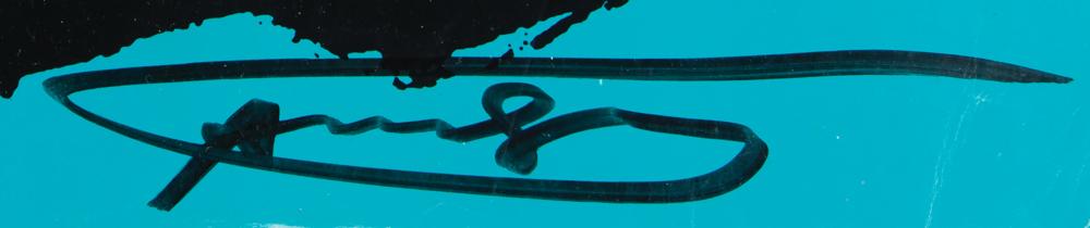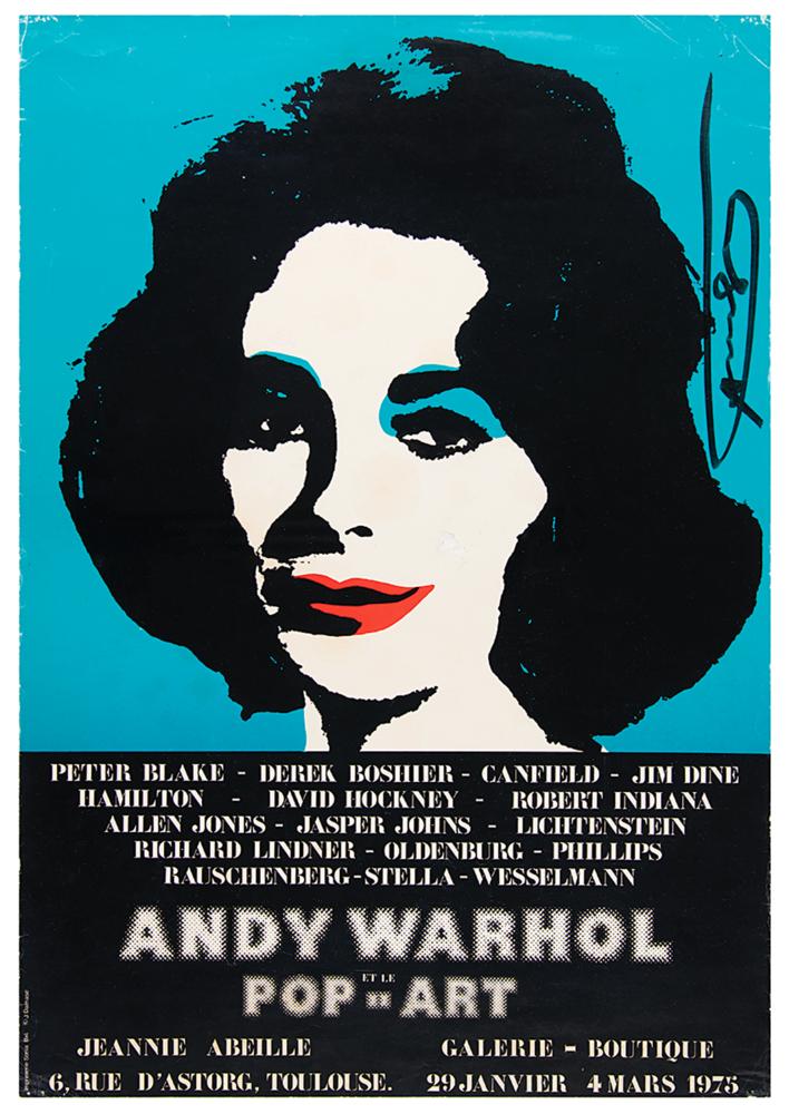 Original color 17.25 x 25 poster for the French art exhibition ‘Andy Warhol et le Pop Art,’ held at the Jeannie Abeille Gallery in Toulouse, France, from January 29 to March 4, 1975, featuring Warhol’s 1963 portrait of Elizabeth Taylor entitled 'Liz,' and listing artists like Peter Blake, David Hockney, Robert Indiana, Jasper Johns, and more, signed vertically along the right-side in black felt tip, “Andy.” Rolled and in very good to fine condition, with staple holes to the corners. some light creasing, and an area of surface loss to Taylor's cheek.