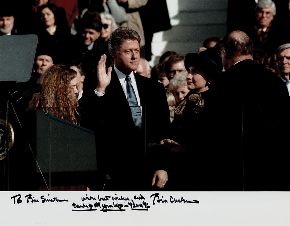 Color glossy 14 x 11 photo of Bill Clinton being sworn into office as president, signed and inscribed in the lower border in black felt tip, "To Bill Smith—with best wishes, and thanks for all your help in '92 and '96, Bill Clinton." In fine condition, with a small crease above Clinton's left shoulder.