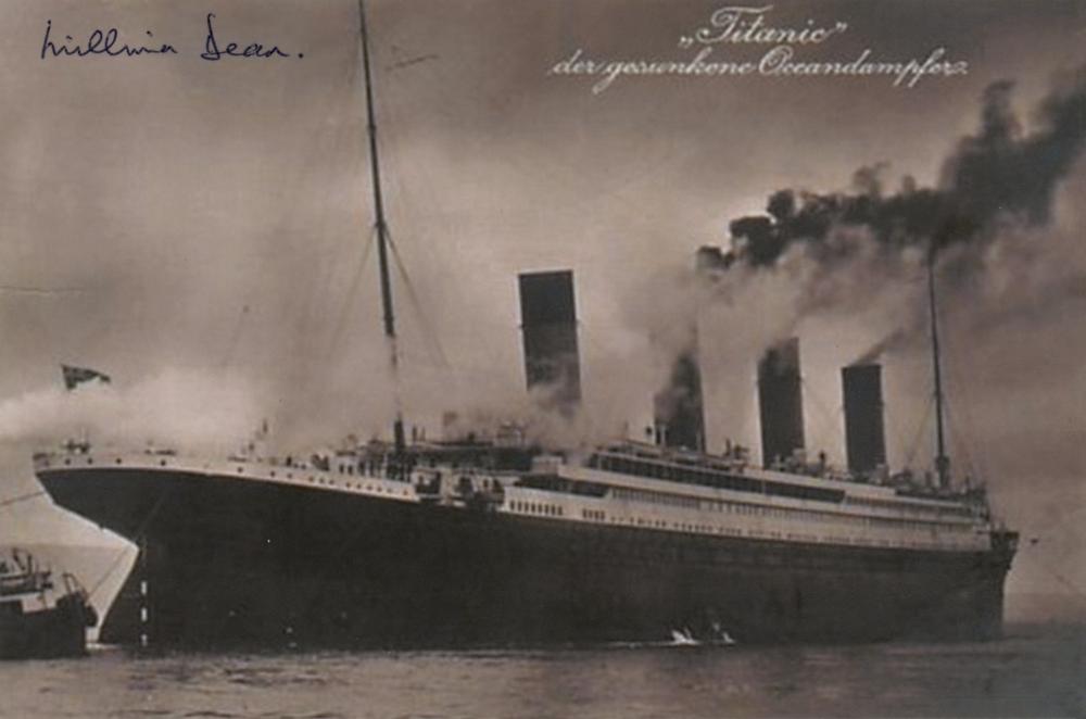 Glossy 6 x 4 photo of the Titanic at sea, signed in black felt tip by the disaster's youngest survivor, "Millvina Dean." In fine condition.