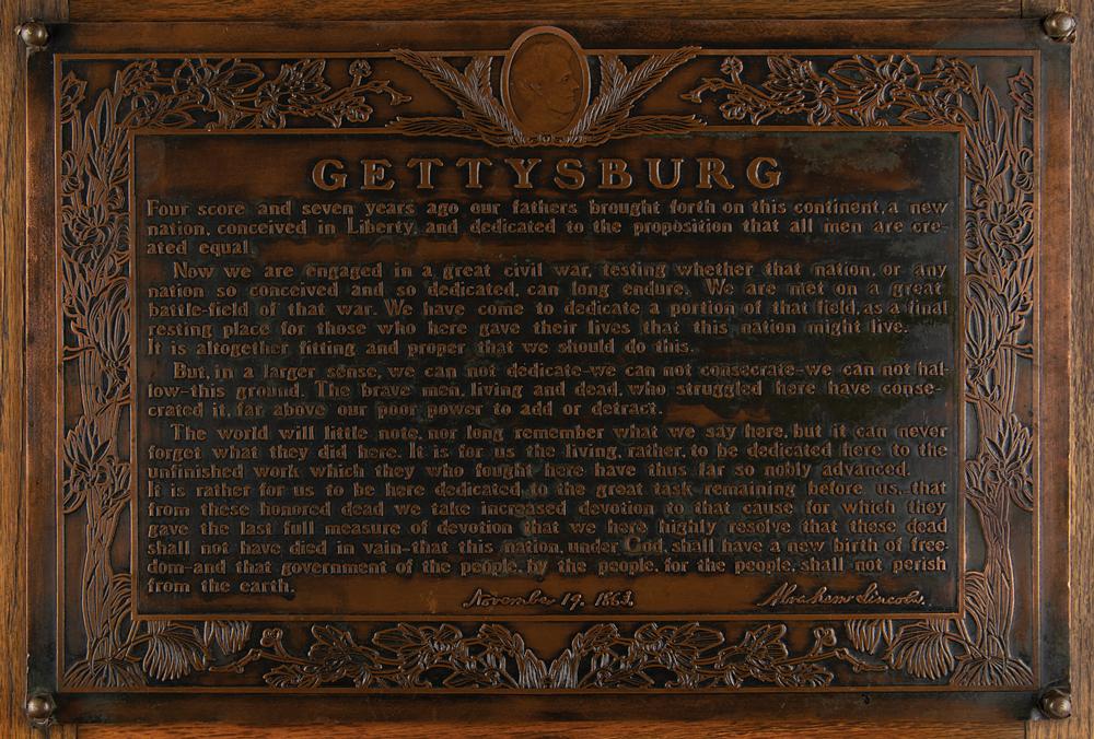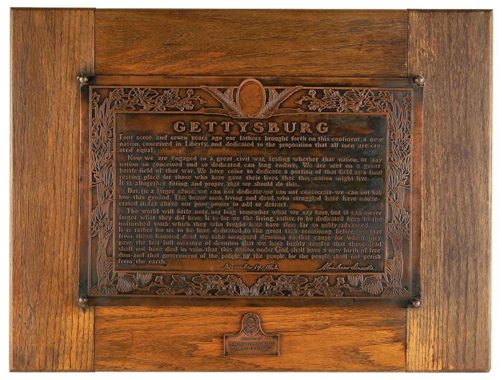 Impressive bronze-and-oak plaque honoring Lincoln's Gettysburg Address