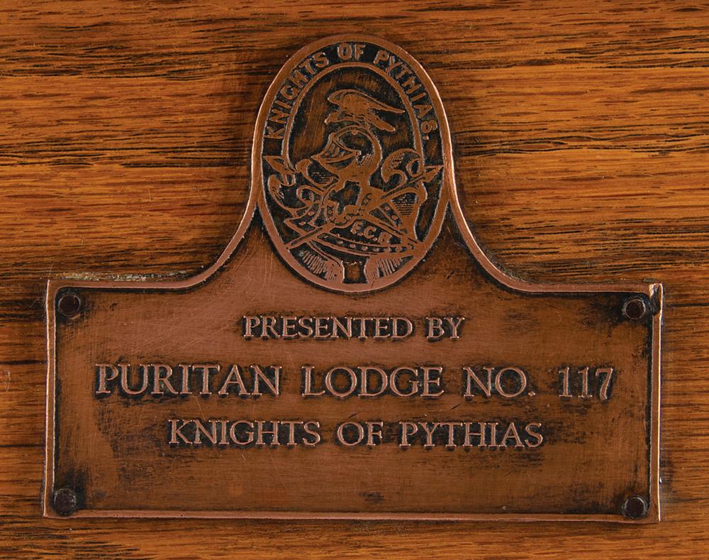 Mid-century heavy bronze plaque commemorating the Gettysburg Address made by President Abraham Lincoln on November 19, 1863. The plaque, 19.5 x 13.25, features the full text of the iconic Civil War speech in raised text with Lincoln’s facsimile signature and date below. A floral border wraps the plaque, which is surmounted by the president’s likeness in profile. The plaque is screw-mounted to a large 27.75 x 21 oak display board, the lower portion of which bears an attached Knights of Pythias plate with embossed text: “Presented by Puritan Lodge No. 117.” In fine condition, with wear to the plaque's corner tips.