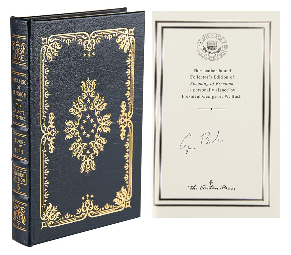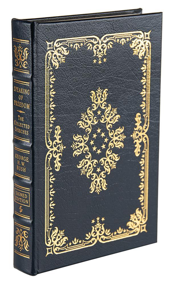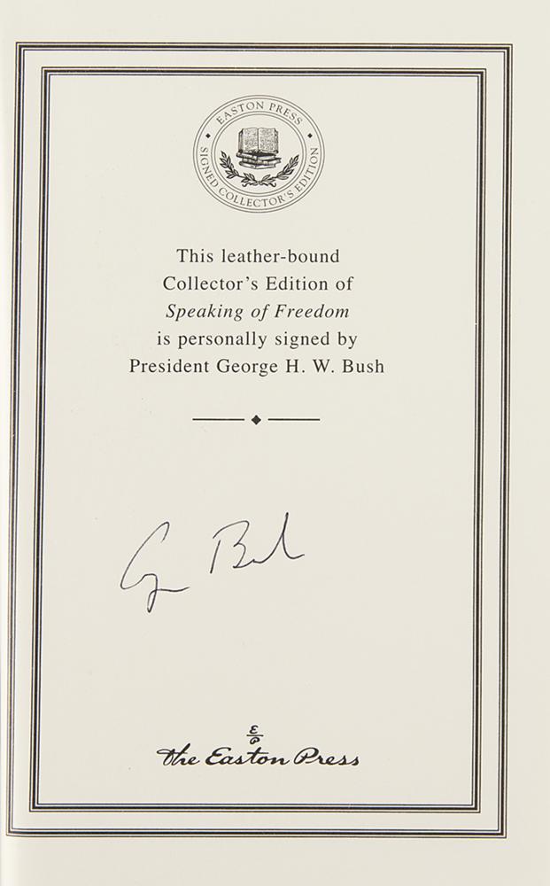 Signed book: Speaking of Freedom: The Collected Speeches of George H. W. Bush. Collector's edition. Norwalk, CT: Easton Press, 2009. Leather-bound hardcover, 6.5 x 9.25, 302 pages. Signed on the colophon in black ballpoint by George Bush. In very fine condition. Accompanied by the publisher's certificate of authenticity.