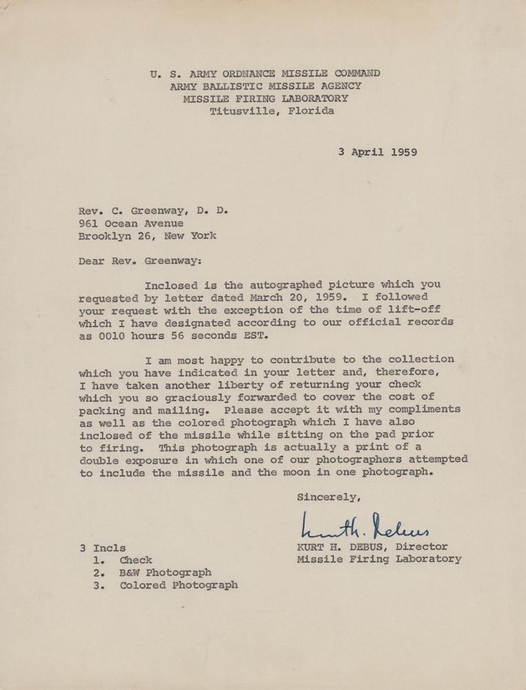 German V-2 rocket scientist (1908-1983) during World War II who, after being brought to the United States under Operation Paperclip, became the first director of NASA's Kennedy Space Center in 1962. Three items signed by Debus: a color glossy 7.75 x 9.75 photo of the Juno II launch vehicle that carried Pioneer 4 into orbit, signed in fountain pen, "Kurt H. Debus, 3 March 1959, 0010 hours, 56 seconds EST"; a matte-finish 8 x 10 photo of the Pioneer 4 launch, signed in fountain pen, "Tuesday, March 3, 1959, 0010 hours, 56 seconds EST, Cape Canaveral, Florida, Kurt H. Debus"; and a TLS signed "Kurt H. Debus," one page, 8 x 10.5, April 3, 1959, sending the signed photos to noted autograph collector Rev. Cornelius Greenway. In overall very good to fine condition, with light scuffing and staple holes to the color photo, and some mottled discoloration to the black-and-white photo.