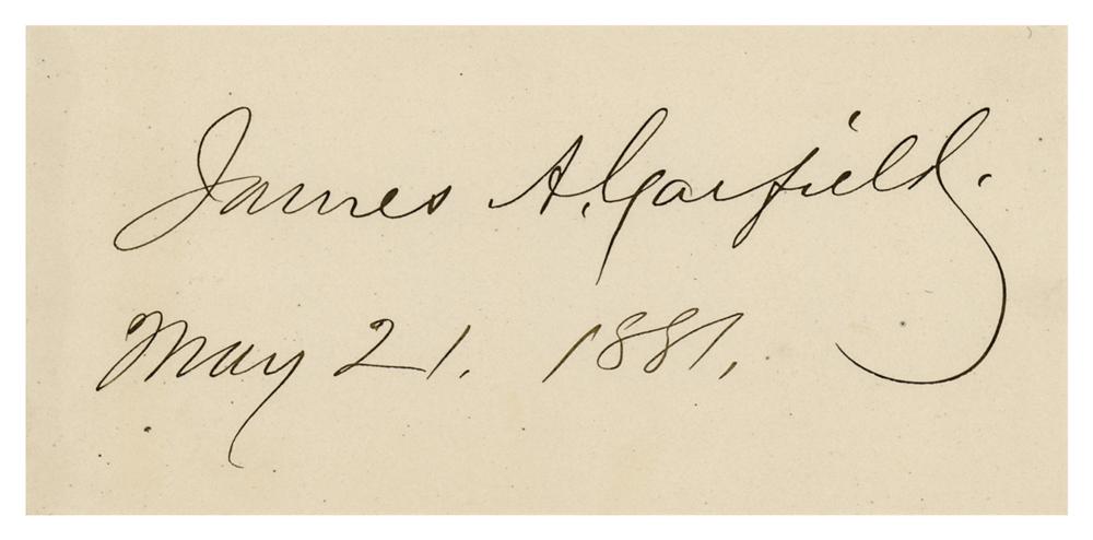 Bold and neat ink signature as president, "James A. Garfield, May 21, 1881,” on an off-white 5.5 x 2.75 slip. In very fine condition. Shot on July 2, 1881, Garfield died on September 19, only 200 days into his term. Signatures of Garfield as president are thus extremely rare, and this is a choice example.