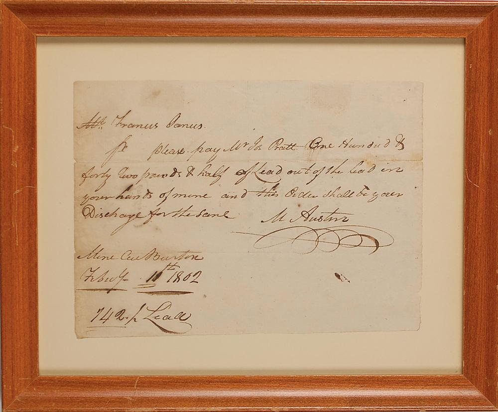 Founder (1761-1821) of the American lead industry, father of Texas pioneer Stephen F. Austin, and the first man to obtain permission to bring Anglo-American settlers into Spanish Texas. ADS, signed “M. Austin,” one page, 7.25 x 5.25, February 11, 1862. Handwritten promissory note by Moses Austin, in full: "Please pay Mr. Jos. Pratt One Hundred & forty two pounds & half of lead out of the Lead in your hands of mine and this order shall be your Discharge for the same." Mounted and framed to an overall size of 10.5 x 8.5. In fine condition.