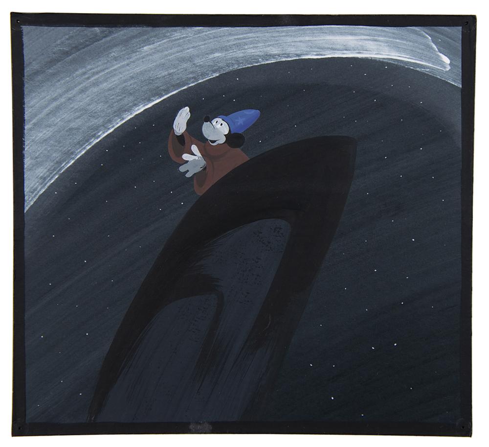 (Walt Disney Studios, 1940) Original concept painting of Mickey Mouse from the 'Sorcerer's Apprentice' segment of Fantasia, which shows the young wizard-to-be during his magical dream sequence: standing atop a pinnacle and wearing the mystical hat of the Sorcerer Yen Sid as a comet streaks past in the sky. The black night sky background is neatly dotted with stars. Accomplished in gouache on black 9.75 x 9 artist's board. In fine condition, with tack holes to corners.
