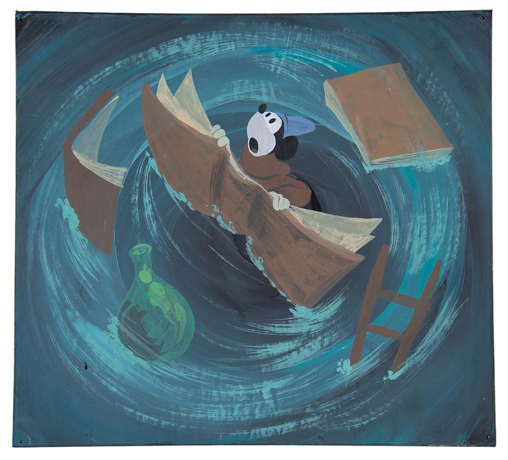 (Walt Disney Studios, 1940) Awesome original concept painting of Mickey Mouse from the 'Sorcerer's Apprentice' segment of Fantasia, showing the young wizard-to-be riding Sorcerer Yen Sid's spellbook through a magical whirlpool during a dream sequence. Accomplished in gouache on black 8.25 x 7.5 artist's board. In fine condition, with tack holes to corners.