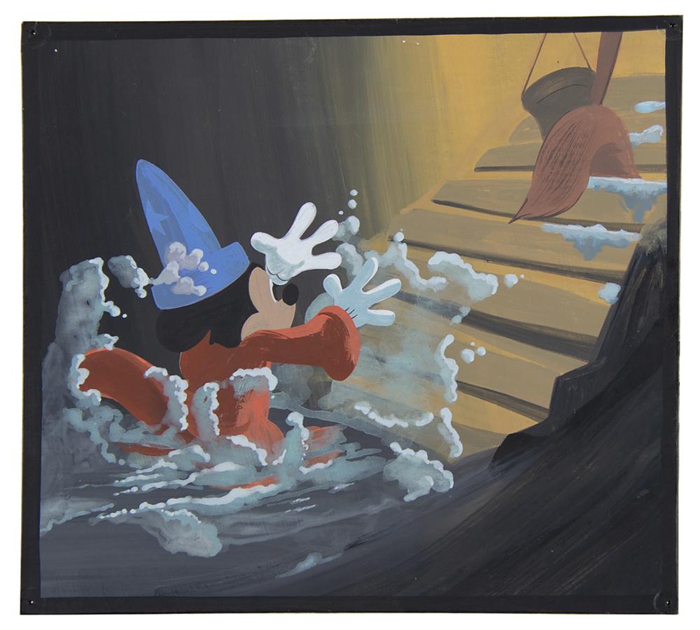 (Walt Disney Studios, 1940) Dramatic original concept painting of Mickey Mouse from the 'Sorcerer's Apprentice' segment of Fantasia, showing the young wizard-to-be in Sorcerer Yen Sid's hat, chasing his magic broom up the stairs as water begins to engulf him. Accomplished in gouache on black 8.5 x 7.75 artist's board. In fine condition, with tack holes to corners. A splendid piece of concept art from one of Disney's greatest and most innovative films.