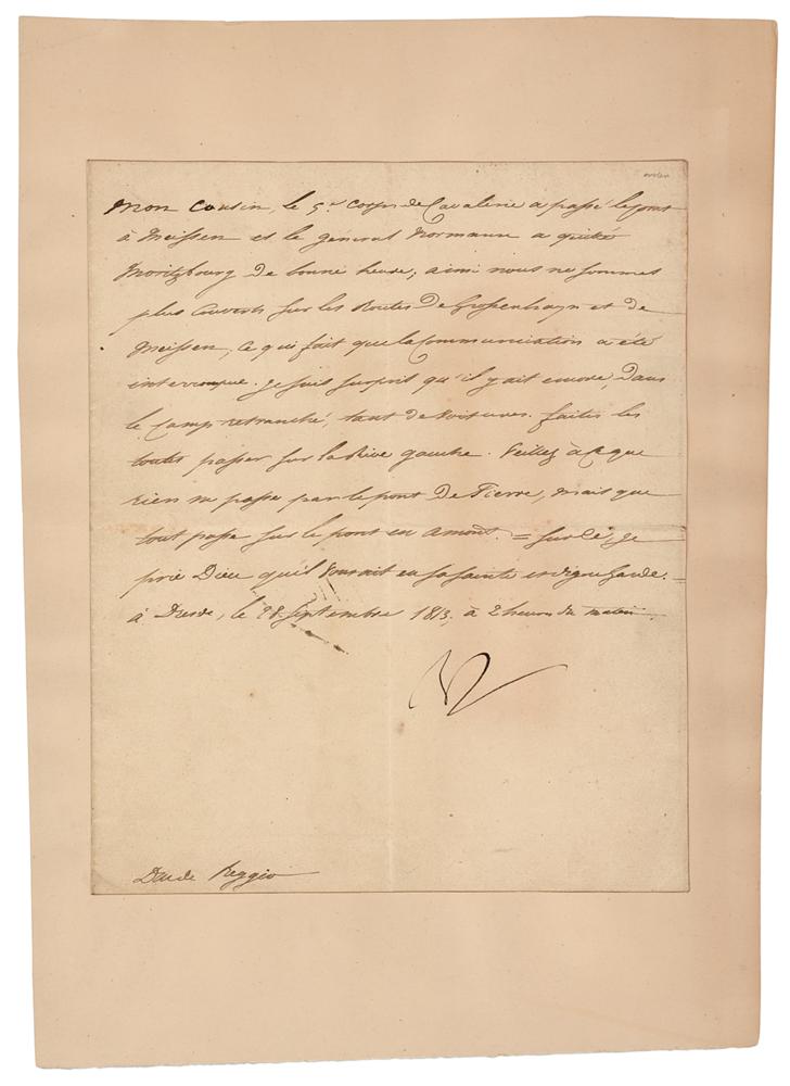 LS in French, signed “Np,” one page, 7.5 x 9, September 28, 1813. Untranslated letter to Nicolas Charles Oudinot, Duke of Reggio, pertaining to military matters concerning the 9th Cavalry Corps under General Normann. The blank integral page has been professionally inlaid into a larger sheet. In fine condition, with some very faint toning.