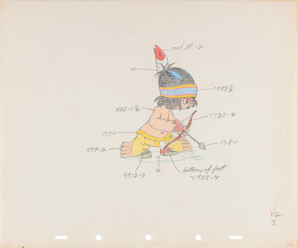 (Walt Disney Studios, 1937) Attractive original markup drawing of the title character from Little Hiawatha, depicting the pint-sized Native American in a serious full-length pose with his bow and arrow. Accomplished in graphite and colored pencil on untrimmed 12 x 10 animation paper marked "12" in the lower right corner; the bottom edge is annotated "S41, Sc. 24." The image, which measures 3.5 x 4.75, features color arranging numbers to various parts of Hiawatha. In fine condition.