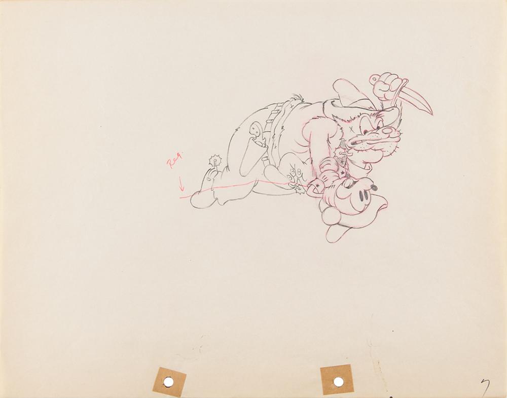 (Walt Disney Studios, 1934) Original production drawing featuring Mickey Mouse and Peg Leg Pete from Two-Gun Mickey, showing them engaged in a violent cowboy knife fight, with Pete prepared to deal Mickey a deadly strike. Accomplished in graphite on untrimmed 12 x 9.5 animation paper marked “7” in the lower right corner. Image measures 6 x 4. In fine condition.