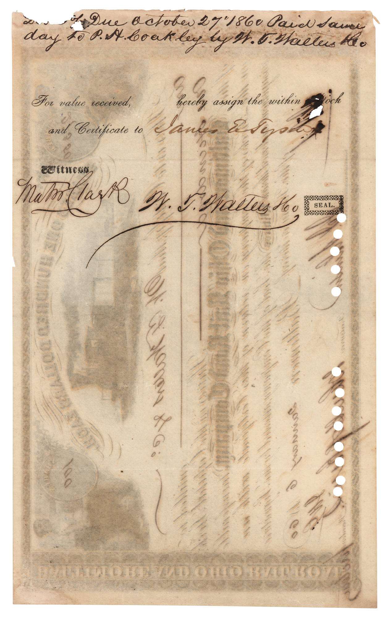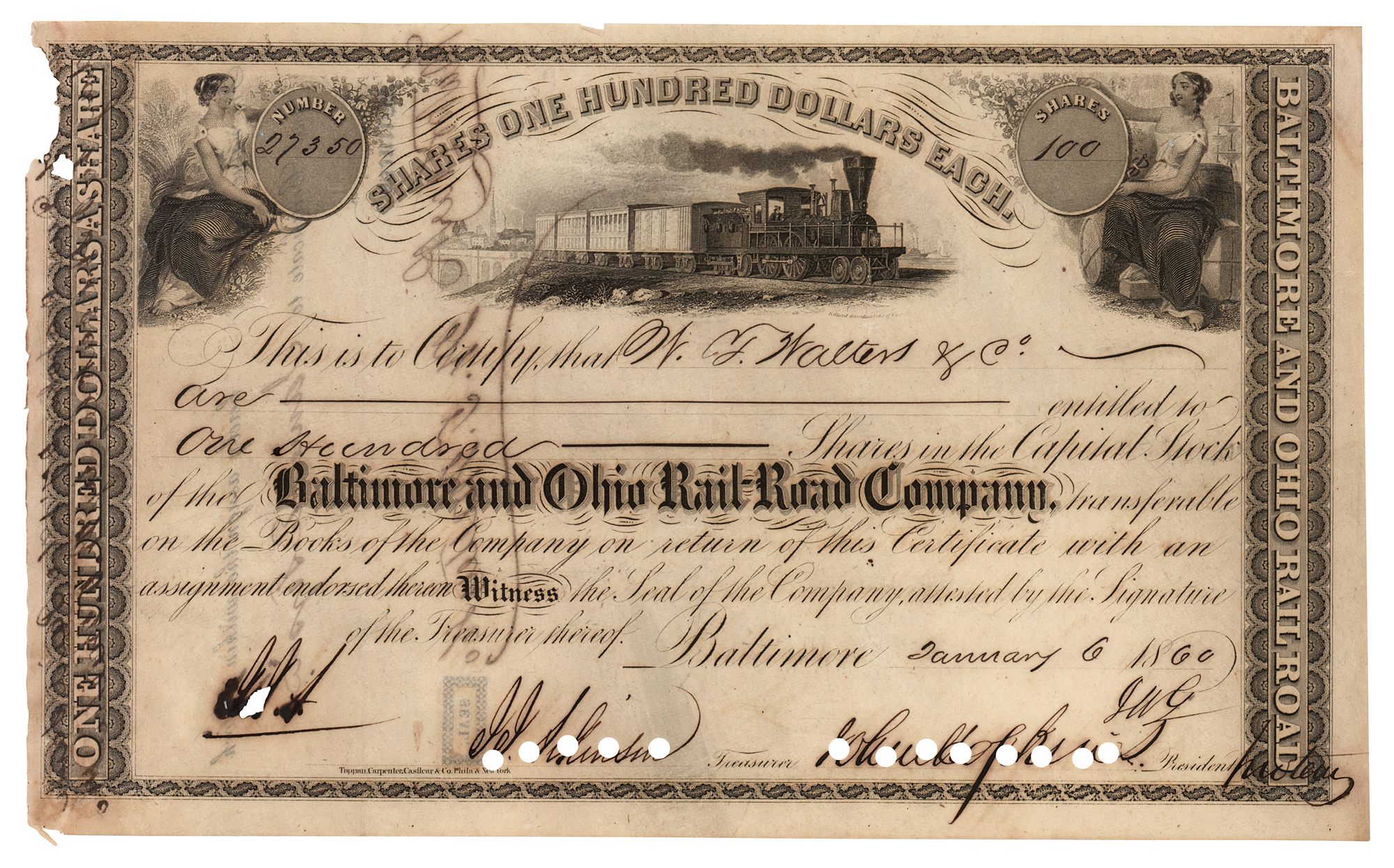 American entrepreneur, abolitionist and philanthropist (1795–1873) whose legacy lives on in numerous foundations and institutions, such as Johns Hopkins Hospital and Johns Hopkins University. Partly-printed DS, one page, 10 x 6.25, January 6, 1860. Stock certificate for 100 shares in the Baltimore and Ohio Rail-Road Company issued to W. T. Walters & Co., signed at the conclusion by Hopkins as the company's president. In very good to fine condition, with cancellation holes affecting the signature, and minor edge tears and losses.