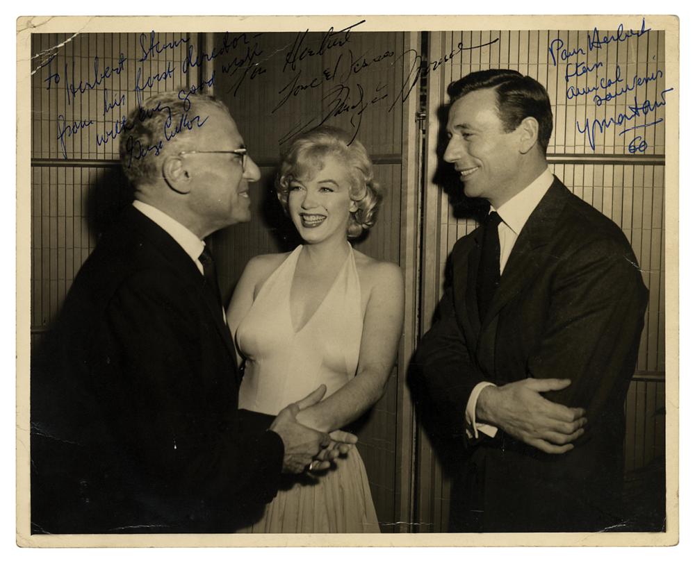 Vintage matte-finish 10 x 8 photo of Monroe on the set of the 1960 musical comedy Let's Make Love with costar Yves Montand and director George Cukor, signed and inscribed in black ballpoint, "For Herbert, love & kisses, Marilyn Monroe." The photo is also signed and inscribed in blue ballpoint by Montand and Cukor. In very good to fine condition, with scattered creasing (heaviest to the upper left corner, and a light crease passing through Marilyn's left cheek), and light silvering to the darker areas of the image. Monroe remains among the most coveted of all Hollywood signatures, with signed photographs, more than essentially all other formats, rightly demanding the attention of interested bidders. The presence of additional signatures to a Monroe-signed photograph—especially those belonging to power players like Cukor and Montand, two men intrinsically linked to Monroe—is exceedingly rare, desirable, and, quite plausibly, a singular occurrence.