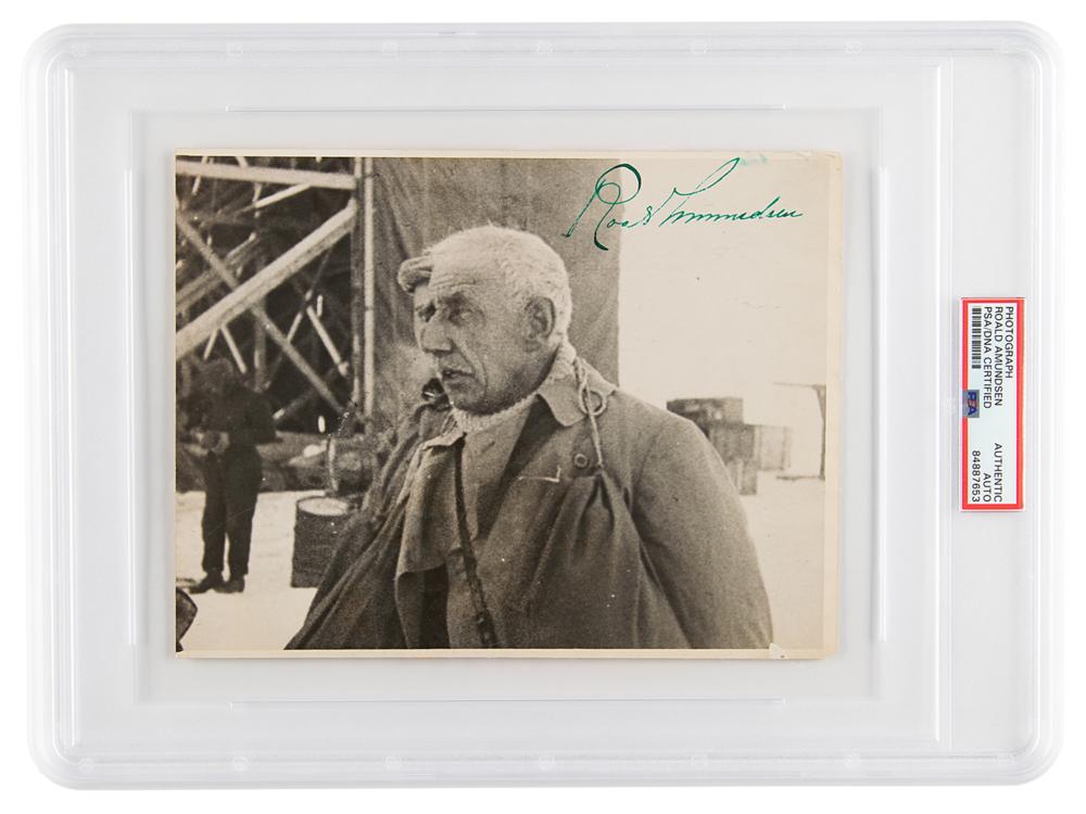 Vintage semi-glossy 8.5 x 6.5 silver gelatin photo of Roald Amundsen in a half-length pose as he appeared at Spitsbergen, Norway before the start of the flight over the North Pole in 1926, signed in green fountain pen. The reverse bears a copyright stamp and press caption sheet. In very good to fine condition, with light rippling and trimmed edges. Encapsulated in a PSA/DNA authentication holder.