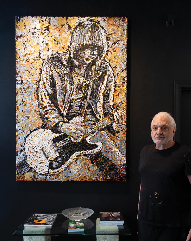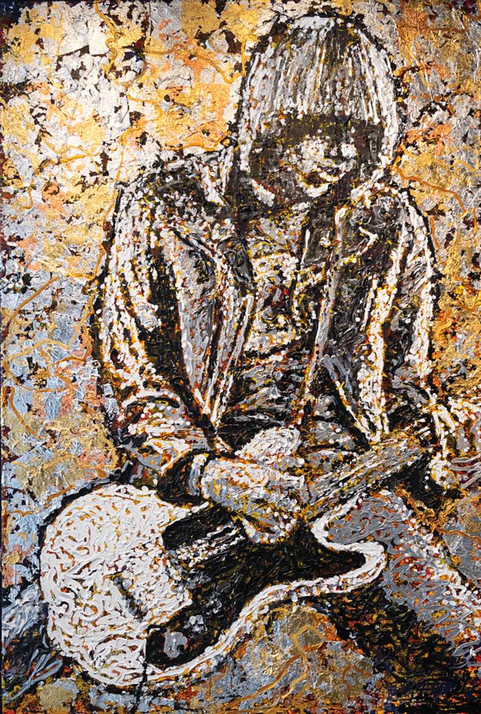 In the artist’s portrait, the guitarist is crafted with a gold and platinum background, symbolic of his superior legacy. Johnny’s bold, black and white guitar serves as a reflection of him as a musician; dark colors standing out in a pool of vivid colors, as though the guitarist is a gem in an empty cave. Giovanni carefully chose his colors by means of significance; Johnny’s guitar was a staple of his career, giving him the opportunity to express deep meaning in a way no one else ever could with words, therefore this bright, snowy piece of the painting is prominent and forces the eye to narrow in on it.