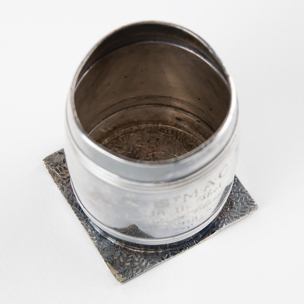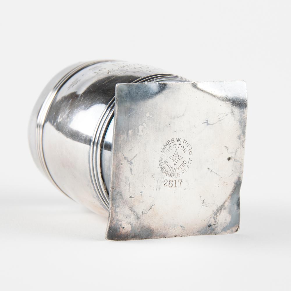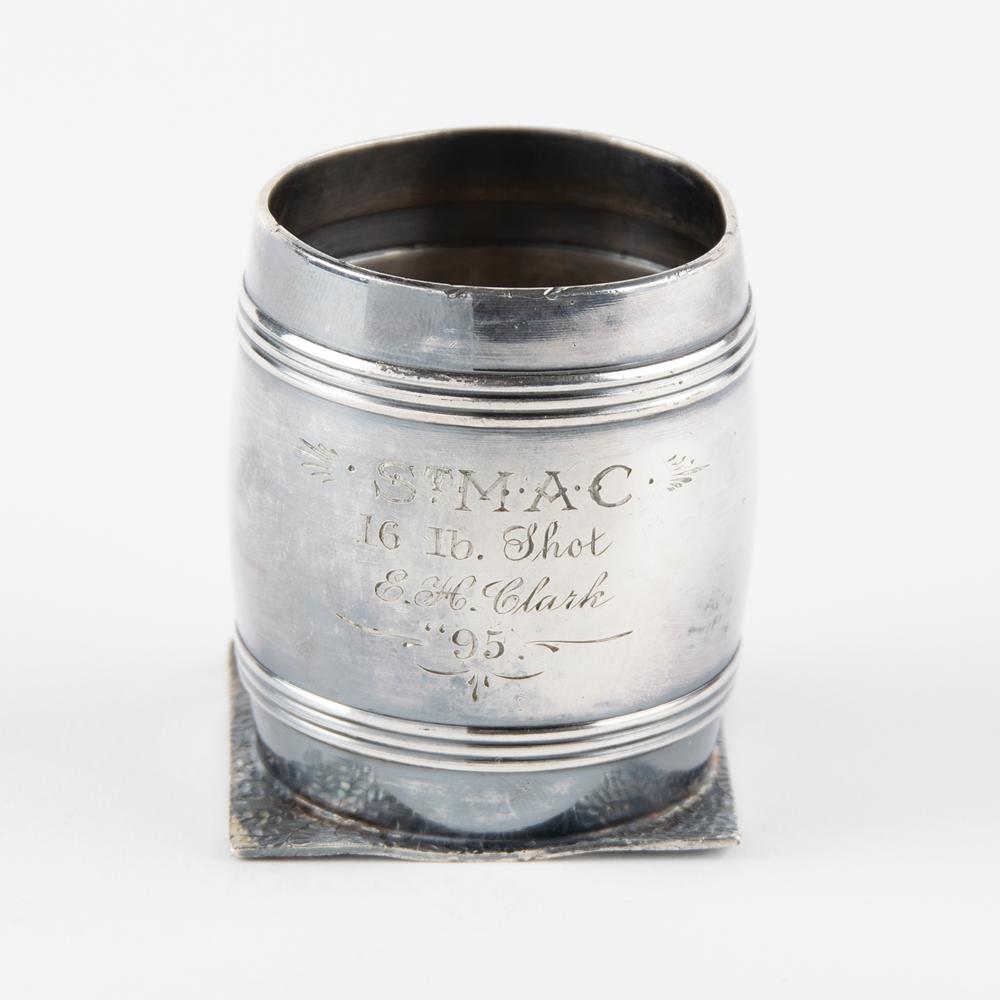 Quadruple plate silver cup awarded to Ellery Clark in 1895, measuring 1.75″ x 2″ x 1.75″, with a presentation engraving on the side: "St. Mac, 16 lb. Shot, E. H. Clark, '95." Bottom bears the maker's mark of James W. Tufts, Boston. Exhibits a few bends and dings. American track and field athlete Ellery Harding Clark (1874-1949), went on to become the first modern Olympic champion in high jump and long jump, and the only person to have won both Olympic events, doing so at the Athens 1896 Olympics.