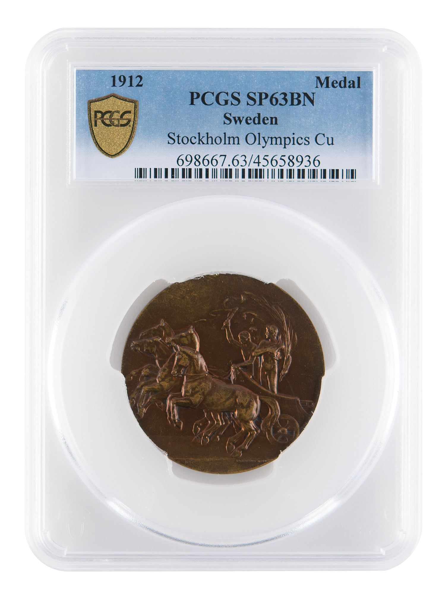 Encapsulated and graded by PCGS SP63BN. Rare participation medal issued for the Stockholm 1912 Olympics. Bronze, 51 mm, 55 gm, by Bertram Mackennal/Erik Lindberg. The front features a raised quadriga with charioteer and judge, preparing to present an athlete with the palm of victory; the reverse bears Zeus seated on a Ionic column in relief, holding a small figure of the goddess Nike, with the city of Stockholm in the background and raised lettering along the top. The medal bears some uneven toning. This is a rare bronze—only 100 were struck.