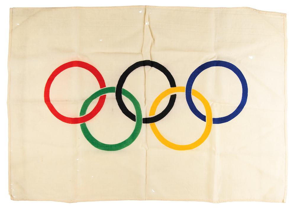 White cloth flag from the Los Angeles 1932 Summer Olympics, measuring 38″ x 26.5″, featuring the colorful Olympic rings at center. In very good condition, with scattered moth holes.